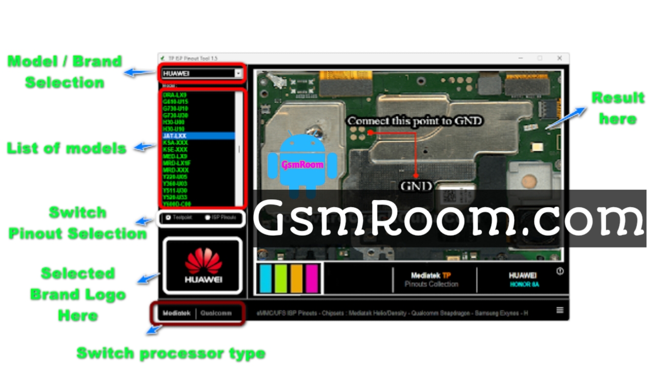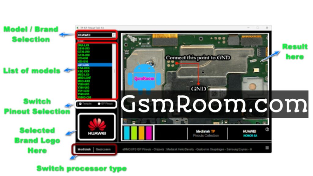 TP ISP Pinout Tool V1.5 is a free Windows program for mobile PCB pinout referencing used by repair professionals. It supports hundreds of device models with visual TP and ISP diagrams — especially useful for EDL/ISP hardware tasks.